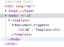 <!DOCTYPE html> <html lang="ko"> <head> <meta charset="utf-8"> </head> <body> <template> <h1>WC - Template</h1> </template> </body> </html>간단하게 Template 태그와 내부에 h1 태그를 삽입하였습니다.